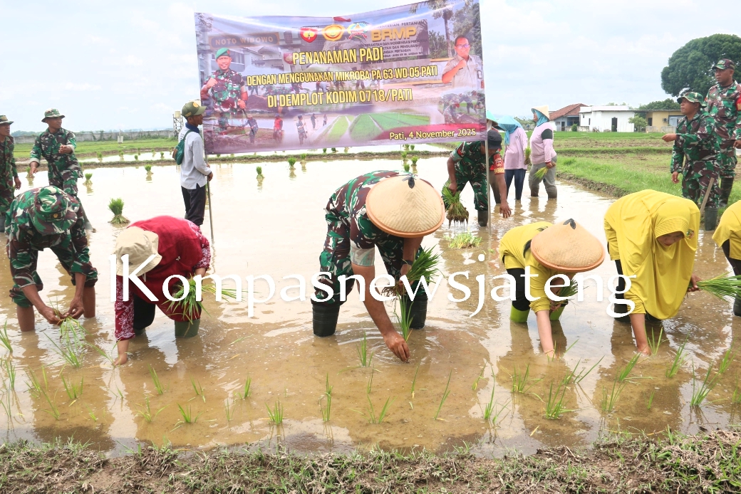 Pati, Kompasnewsjateng.com, – Dalam upaya mendukung program ketahanan pangan nasional dan meningkatkan produktivitas hasil pertanian, Kodim 0718/Pati melalui Koramil 16/Jaken melaksanakan kegiatan penanaman padi menggunakan teknologi mikroba PA 63 WD 05 Pati di lahan demplot pertanian Kodim 0718/Pati, bertempat di lahan pertanian BRMP, Desa Sidomukti, Kecamatan Jaken, Kabupaten Pati.