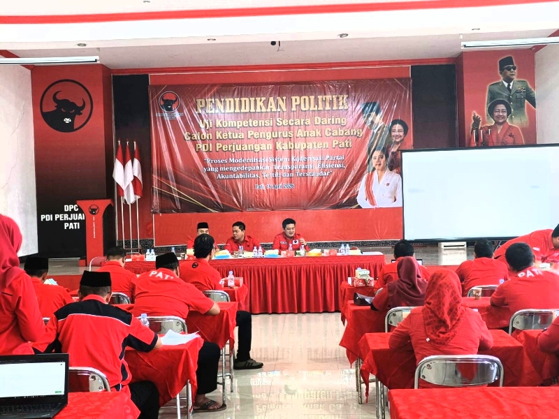 PATI, Kompasnewsjateng.com – Calon ketua PAC PDI Perjuangan sekabupaten Pati melaksanakan pendidikan politik dengan cara uji kompetensi secara daring dilaksanakan di kantor DPC Kabupaten Pati Jawa Tengah, Minggu ( 19/4/26 ). Setiap calon ketua PAC harus mengikuti uji kompetensi pendidikan politik tersebut agar bisa menjadi ketua PAC PDI Perjuangan.