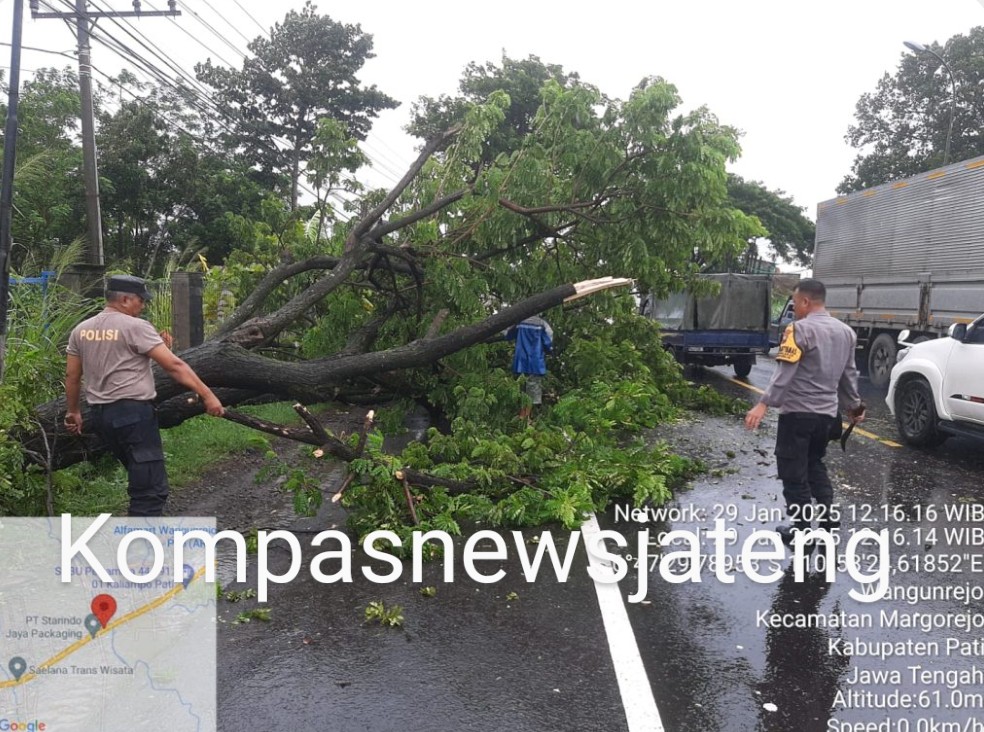 PATI, Kompasnewsjateng.com – Polsek Margorejo Polresta Pati bersama relawan BPBD evakuasi pohon tumbang di jalan Raya Pati-Kudus turut Kaliampo Desa Wangunrejo Kecamatan Margorejo Kabupaten Pati. Rabu (29/01/2025).