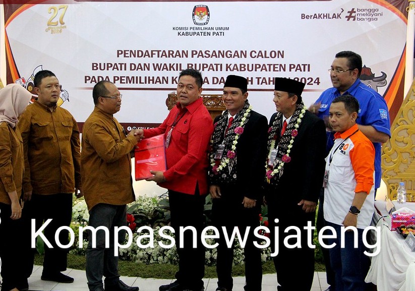 PATI, Kompasnewsjateng.com – Partai Demokrasi Indonesia Perjuangan (PDIP), Partai Demokrat, dan Partai Keadilan Sejahtera (PKS) secara resmi mengusung Wahyu Indriyanto dan Suharyono sebagai calon bupati dan wakil bupati Pati periode 2024-2029. Ketiga partai bersama dengan ribuan relawan mendatangi Kantor Komisi Pemilihan Umum (KPU), Kamis 29 Agustus 2024 untuk mendaftarkan keduanya maju di panggung Pemilihan Bupati (Pilbup) Pati melawan pasangan Sudewo-Chandra yang telah mendaftar sebelumnya.