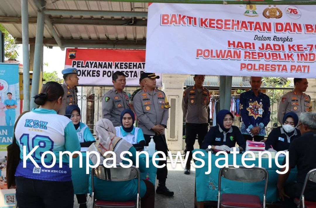 PATI, Kompasnewsjateng.com – Dalam rangka peringatan Hari Jadi Polisi Wanita (Polwan) yang ke-76, Kepolisian Resor Kota Pati melaksanakan bakti sosial (baksos) kesehatan dan memberikan paket sembako kepada warga Kecamatan Pucakwangi. Kegiatan tersebut dilaksanakan di kantor Kecamatan Puncakwangi Kabupaten Pati Jawa Tengah pada Jumat (6/9/2024) pagi.