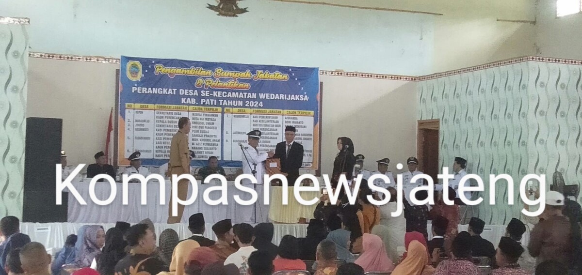 PATI, Kompasnewsjateng.com – Sebanyak 21 perangkat desa dari 9 desa di Kecamatan Wedarijaksa Pati dilantik pada Senin 18 November 2024 di kantor PGRI setempat. Salah satu yang menarik perhatian dari puluhan Perades terpilih ini adalah kehadiran sosok Slamet Riyadi sebagai Kepala Dusun Tapen terpilih dari Desa Tawangharjo.