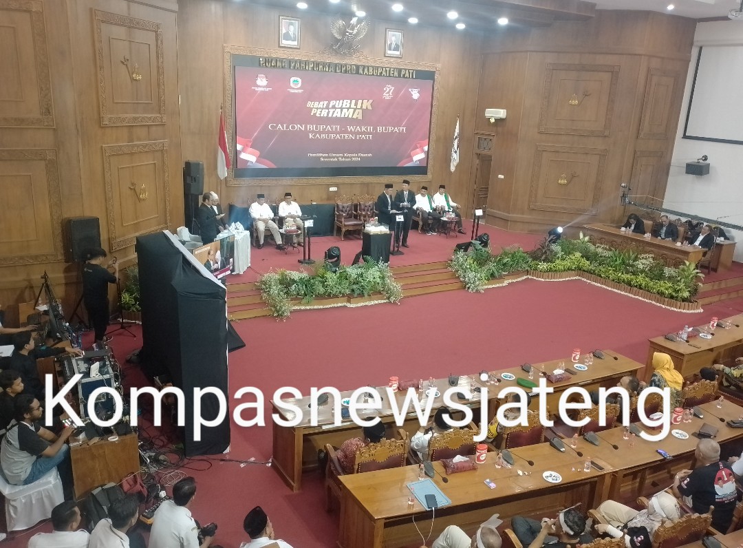 PATI, Kompasnewsjateng.com – Tiga pasangan calon (paslon) Bupati Pati yakni Sudewo-Chandra, Wahyu-Suharyono, dan Budi-Novi mengikuti debat perdana jelang Pemilihan Bupati Pati, di ruang sidang paripurna DPRD Pati, Rabu 30 Oktober 2024.