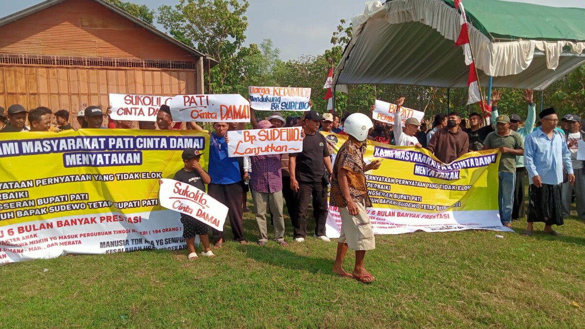 PATI, Kompasnewsjateng.com – Masyarakat di Kecamatan Sukolilo, Kabupaten Pati menyerukan aksi Pati Cinta Damai di tengah isu-isu kurang sedap yang saat ini menerpa Bumi Mina Tani. Minggu (24/8/2025), Ratusan masyarakat dari 16 desa di Kecamatan Sukolilo berkumpul di Lapangan Desa Gadudero, menyerukan keberlanjutan pembangunan yang saat ini gencar dilakukan oleh Bupati Sudewo.